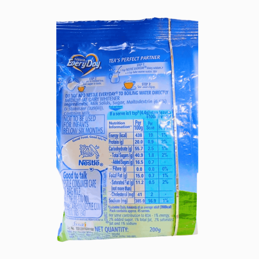 Crafted using advanced technology and high-quality milk solids, Nestlé Everyday Dairy Whitener offers a consistent taste and texture that blends effortlessly into hot beverages. It dissolves quickly, leaving no lumps, and enhances the natural flavor of your drink. Its rich and creamy profile makes it an excellent choice not only for tea and coffee but also for desserts, sweets, and culinary preparations.
